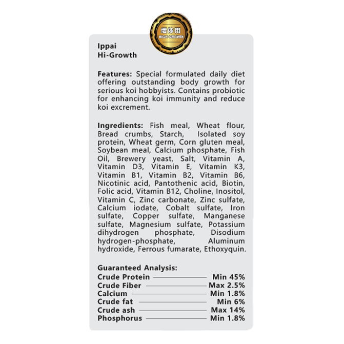 Fish meal, Wheat flour, Bread crumbs, Starch, Isolated soy protein, Wheat germ, Corn gluten meal, Soybean meal, Calcium phosphate, Fish Oil, Brewery yeast, Salt, Vitamin A, Vitamin D3, Vitamin E, Vitamin K3, Vitamin B1, Vitamin B2, Vitamin B6, Nicotinic acid, Pantothenic acid, Biotin, Folic acid, Vitamin B12, Choline, Inositol, Vitamin C, Zinc carbonate, Zinc sulfate, Calcium iodate, Cobalt sulfate, Iron sulfate, Copper sulfate, Manganese sulfate, Magnesium sulfate, Potassium dihydrogen phosphate, Disodium hydrogen-phosphate, Aluminum hydroxide, Ferrous fumarate, Ethoxyquin.