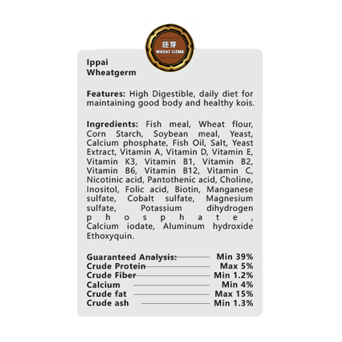 Fish meal, Wheat flour, Corn Starch, Soybean meal, Yeast, Calcium phosphate, Fish Oil, Salt, Yeast Extract, Vitamin A, Vitamin D, Vitamin E, Vitamin K3, Vitamin B1, Vitamin B2, Vitamin B6, Vitamin B12, Vitamin C, Nicotinic acid, Pantothenic acid, Choline, Inositol, Folic acid, Biotin, Manganese sulfate, Cobalt sulfate, Magnesium sulfate, Potassium dihydrogen phosphate, Calcium iodate, Aluminum hydroxide, Ethoxyquin.