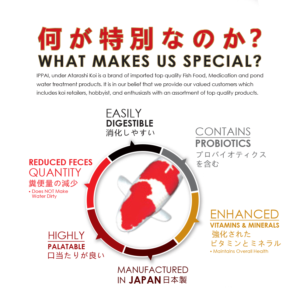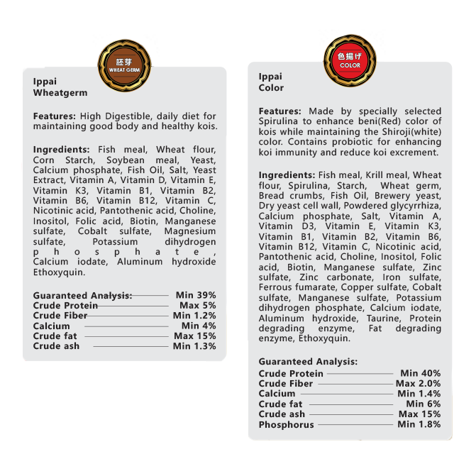Colour: Fish meal, Krill meal, Wheat flour, Spirulina, Starch, Wheat germ, Bread crumbs, Fish Oil, Brewery yeast, Dry yeast cell wall, Powdered glycyrrhiza, Calcium phosphate, Salt, Vitamin A, Vitamin D3, Vitamin E, Vitamin K3, Vitamin B1, Vitamin B2, Vitamin B6, Vitamin B12, Vitamin C, Nicotinic acid, Pantothenic acid, Choline, Inositol, Folic acid, Biotin, Manganese sulfate, Zinc sulfate, Zinc carbonate, Iron sulfate, Ferrous fumarate, Copper sulfate, Cobalt sulfate, Manganese sulfate, Potassium dihydrogen phosphate, Calcium iodate, Aluminum hydroxide, Taurine, Protein degrading enzyme, Fat degrading enzyme, Ethoxyquin.